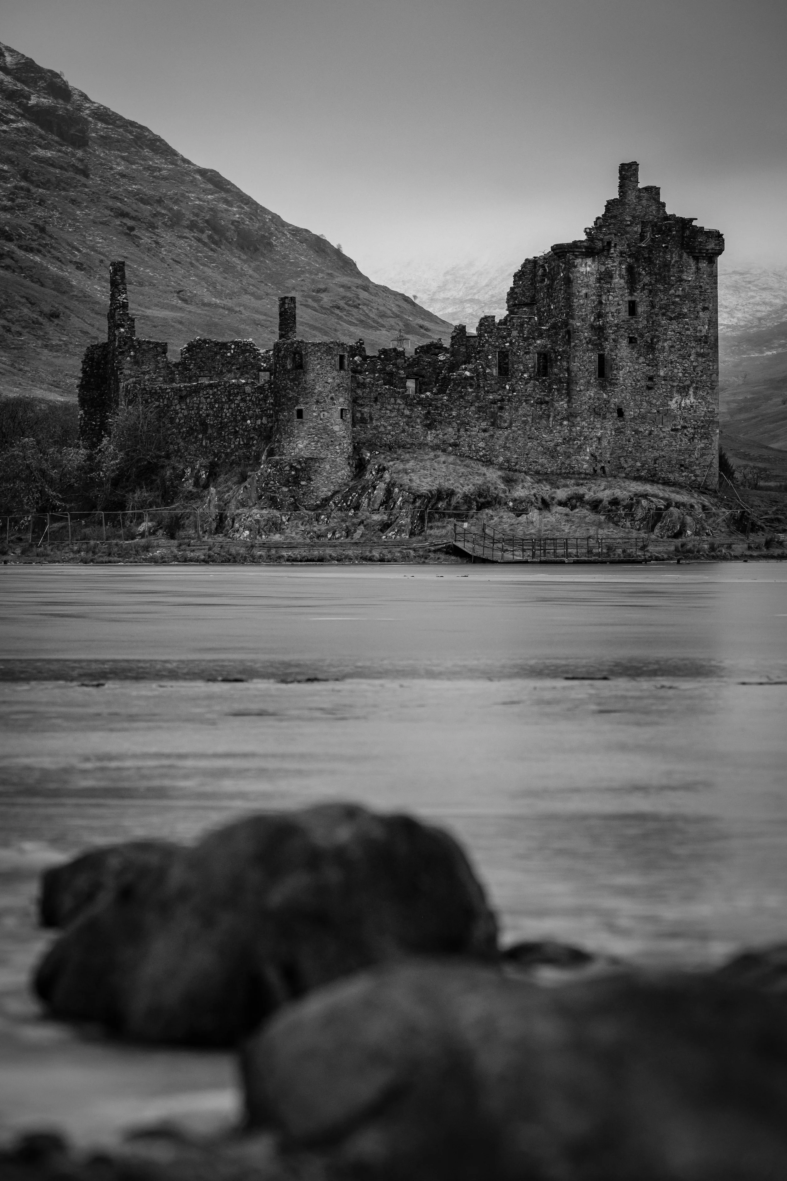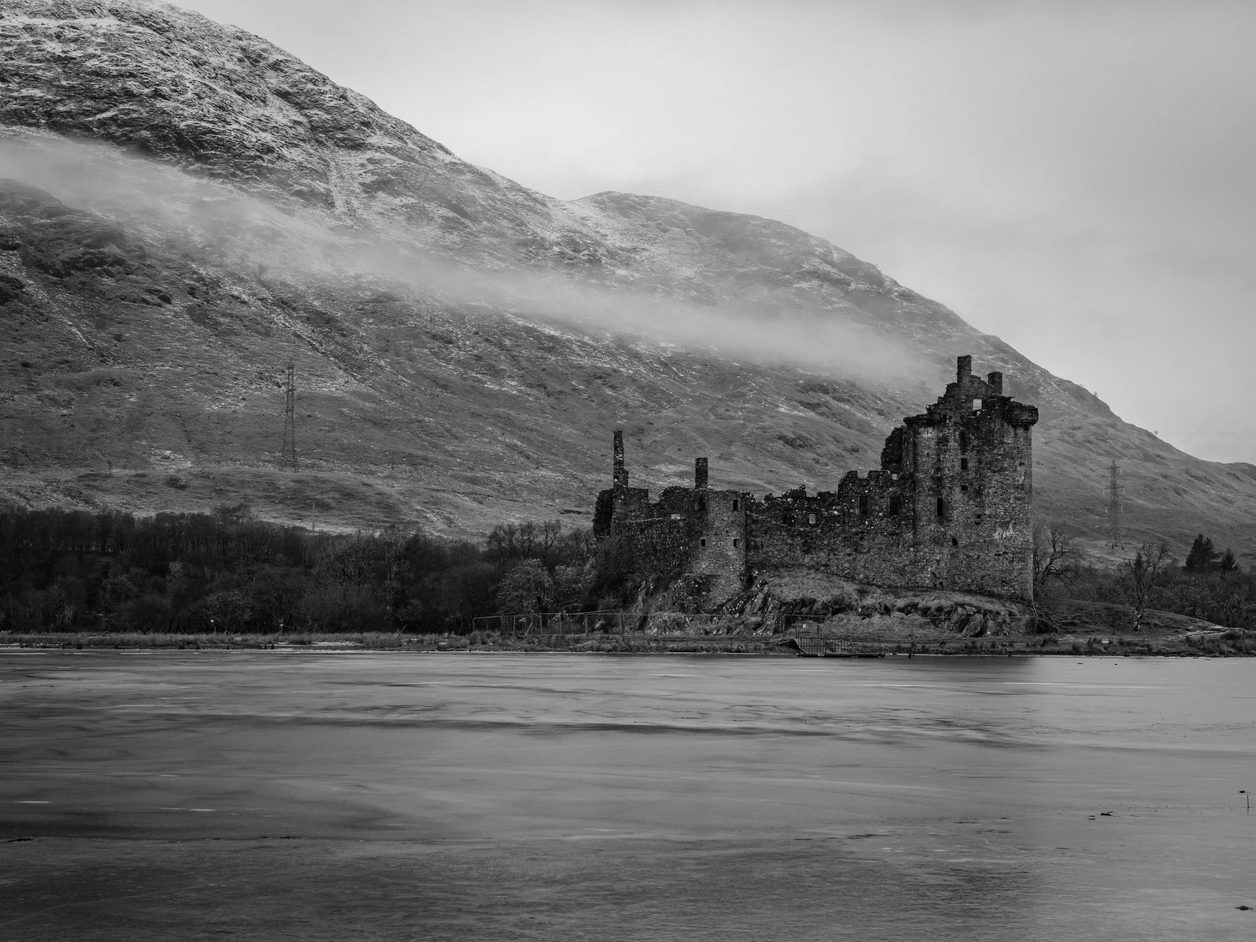 When the castle finally came into view, the effort made sense. Loch Awe was completely frozen. Not partially edged with ice, not broken by wind — fully sealed. A rare sight. The ruined walls stood against a sheet of pale winter blue, reflected not in water but in ice. It transformed the scene entirely. The cold had simplified everything: fewer textures, fewer distractions, just structure and tone. It felt less like a photograph waiting to happen and more like a document of a moment that doesn’t come often.